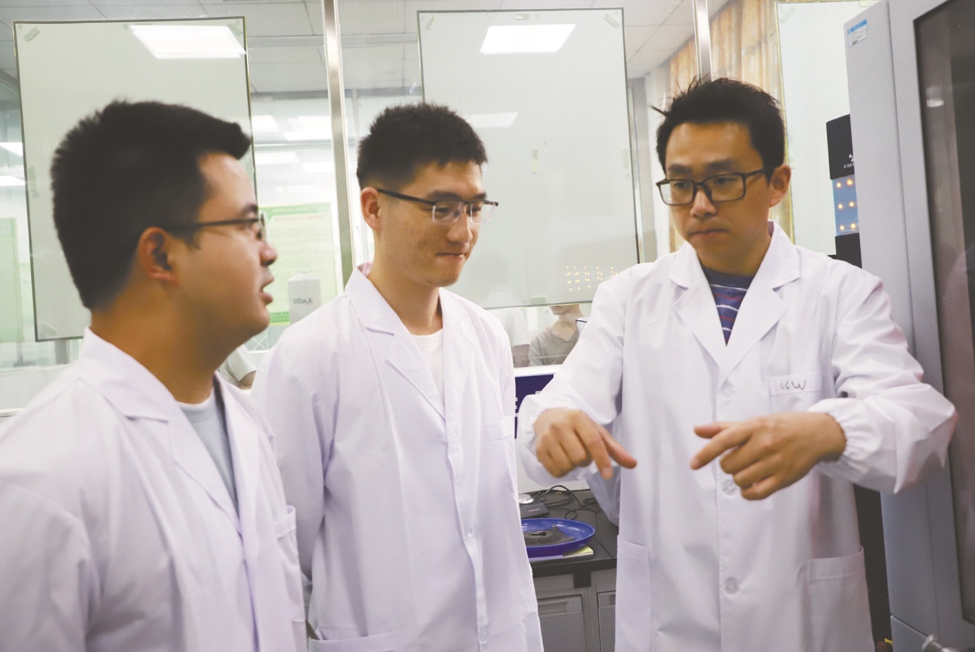 “南鄂英才”、湖北省重點聯系專家吳聰聰(右一)與咸寧企業聯合開展特殊涂層研發項目攻關。